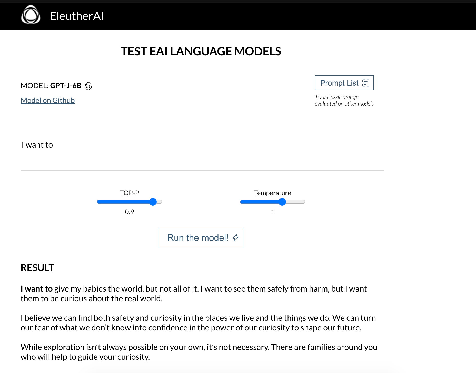 Head over to 6b.eleuther.ai to play around with the model. Without getting too technical, both top-p and temperature increase the "creativity" of the generated text. As they increase, the model is more likely to select unlikely words. Below is a sample input and output using the default settings.