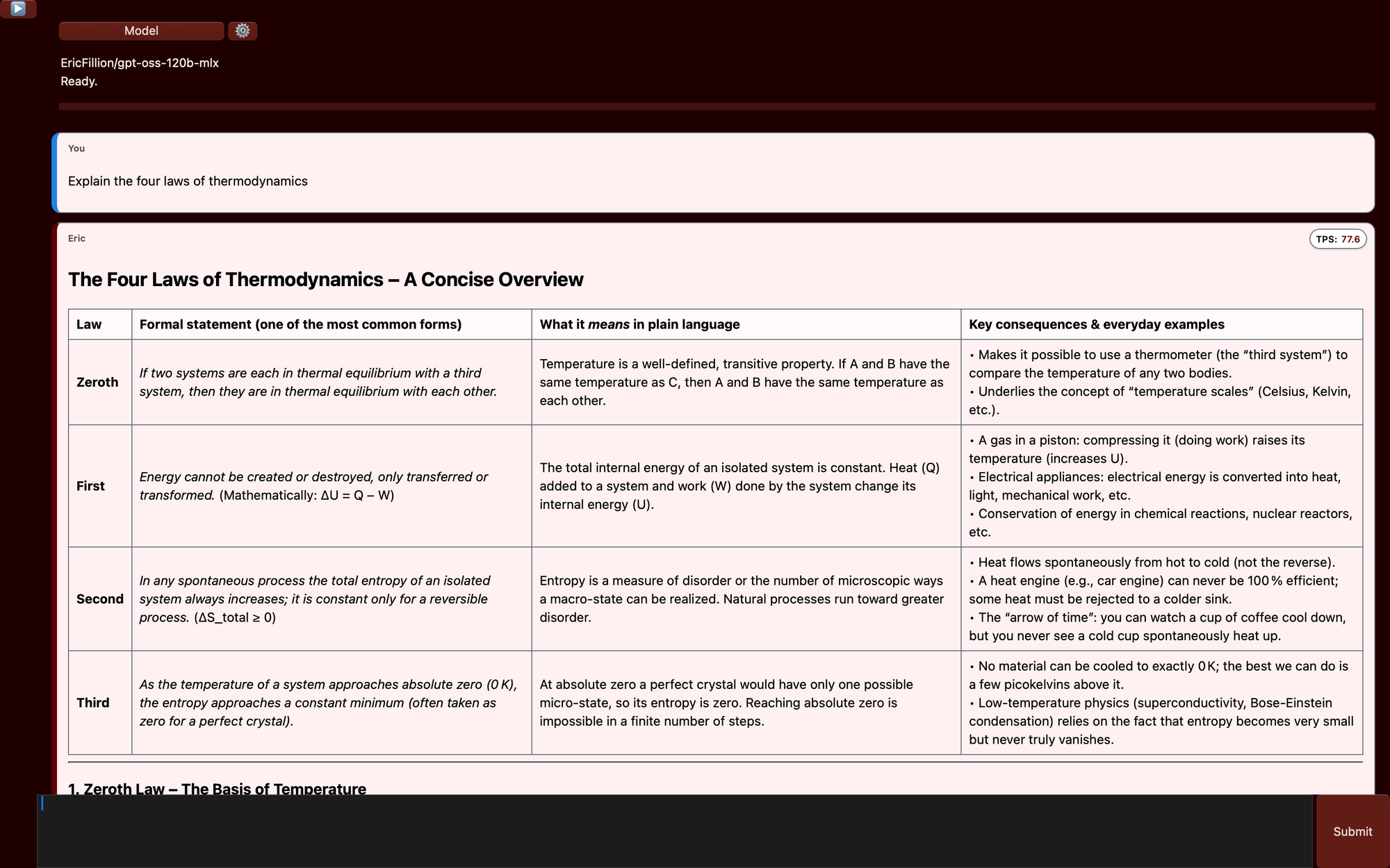 Notice how 77.6 tokens per (TPS) were generated with a 120 billion parameter model in the example above. This was done on a MacBook pro with an M4 Max chip.